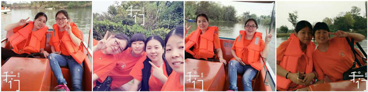 午饭后去划船啦?。?!清澈的湖水,让人心旷神怡,突然后面有搜船在追赶着我们,是电销的男童鞋,开始了水上划船大赛,经过两圈的角逐,还是我们赢了,可以停下来欣赏下这美丽的景色,再美美的拍个照片,看我们客服部的菇凉们多开心: