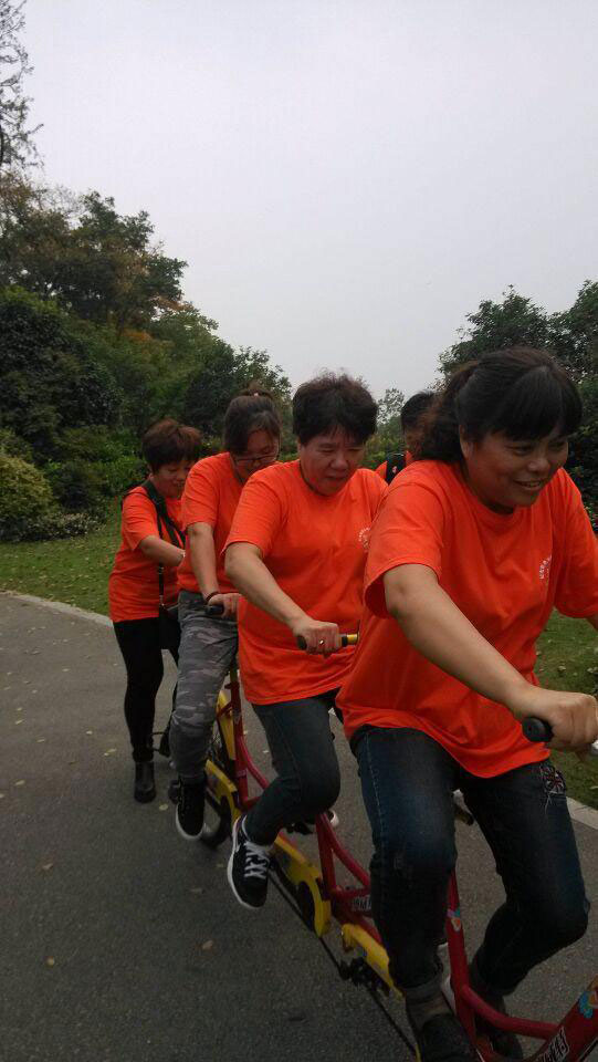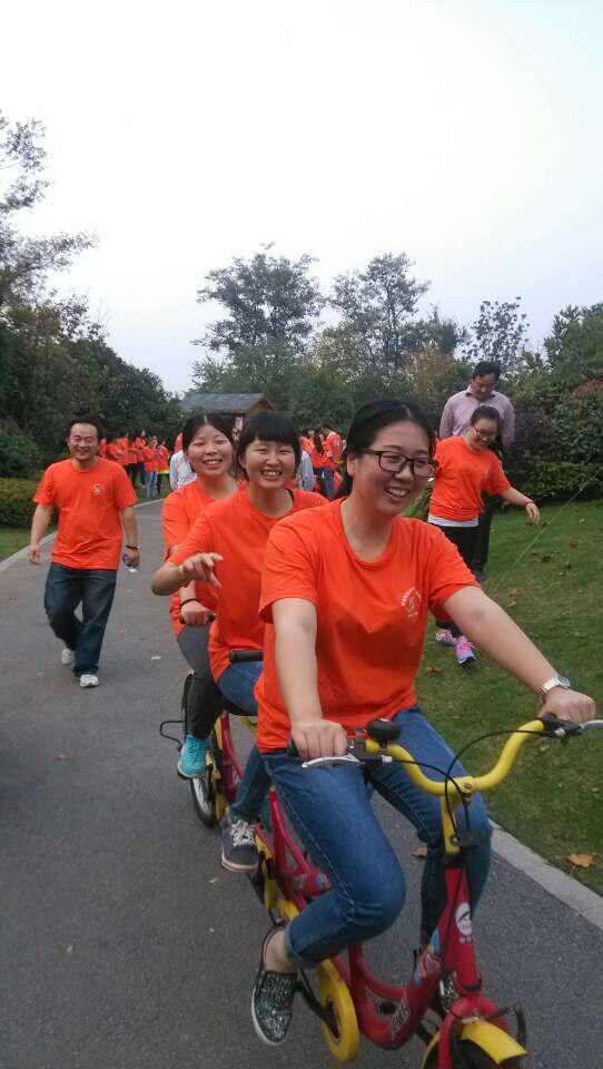 各位,别被假像迷惑,别以为下面笑得开心的三美女获胜了,她们虽然没有挑战成功,但她们还是很开心地骑回了终点;而后面的两位淡定哥和淡定姐才是本场二人组自行车比赛的赢家,所以我也总结出了一句真理送给大家:学会淡定、相信自己会成功!让我记忆更深的是晚上淡定哥老谈在晚会既颁奖典礼上的感言,本来他是没报二人组自行车比赛的、原本二人组已诞生了,但是淡定哥心里想挑战下,在尹总的鼓励下踊跃报名参加了,终抱得的奖杯,用他的话说:要抓住机会,不断去挑战,没有好只有更好!在我们工作中亦是如此,不要觉得自己不行,相信自己肯定行,不断突破自己,突破制定的目标是进步!