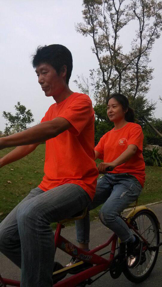 说到快乐,不得不说下午的三人自行车和二人自行车比赛,走,去瞧瞧他们的赛况,尹总和张会计宋经理来参赛了: