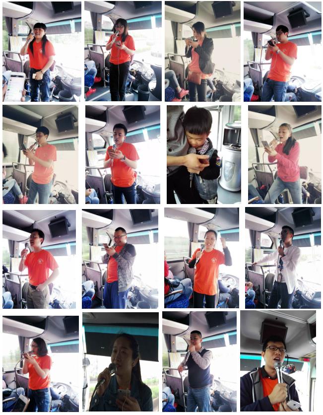早上6点40左右,君通的小伙伴们兴致满满的来到公司楼下集合,经过短暂的集中等待便正式出发了。早上的天气并不是很好,阴云密布,我们一直担心会下雨,可能是我们君通小伙伴的热情太高涨,连天气都在为我们开“绿灯”。不一会天空渐渐明朗了起来。从大巴车开动的那一刻,大家集体开启了嗨歌模式,小伙伴们自发或推荐,踊跃上场用车上自带的话筒给大家献歌。没有伴奏,没有和声,但丝毫没有影响到大家的正常发挥,市场的老前辈更是积极带头,在这简约但不简陋的舞台上一展歌喉。还别说,正是因为清唱,更加充分的展示了大家超高的水平,看看这些图片知道了: