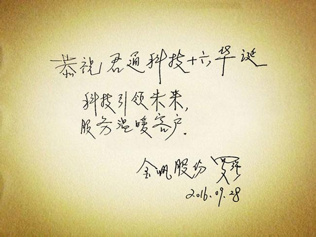 君通的成长离不开员工的辛勤耕耘,离不开所有君通家人的默默付出!是大家一起在共同努力打造和完善这个共同的家园!同样也离不开广大客户朋友的信赖与支持,是他们十几年如一日的与君通携手同行,促进了君通的成长、发展和壮大,在君通17岁生日这样重要的时刻,他们同样没有缺席,依然从远方送来了真诚的祝福: