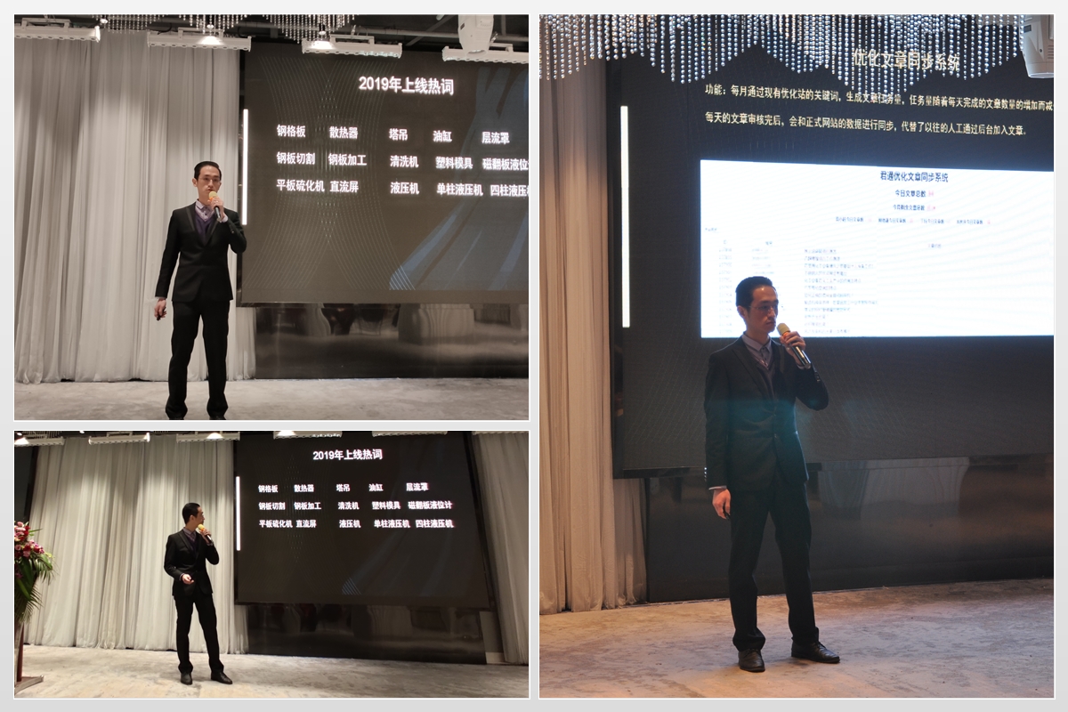 公司担任优化大梁的就是不一样,一上来就给我们展示目前来说单词优化比较难做,但是却被做上去而且一直排名很好的一些关键词,同时也做了很多优化方面的数据分析,以及平时涉及到优化所做的一些辅助工作,也对2020年自己的工作做了很好的规划,能够为公司的优化业绩提升,接下来是技术部的另一位大咖顾总监的工作报告,今年的报告很不一般,