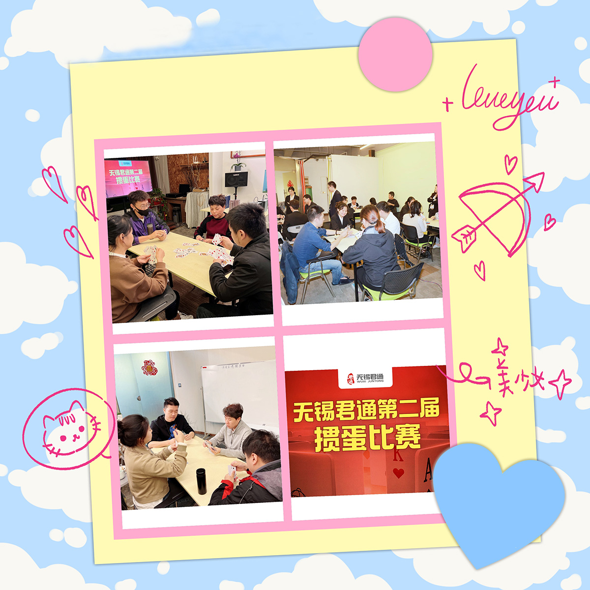 阳光和煦,微风不燥,徜徉在大自然的怀抱中,带着一份份欢喜和希冀,君通的家人们陶醉于一个又一个精彩的团队游戏:“蒙眼吃香蕉、一圈到底、跳绳、踢毽子、呼啦圈、第二届掼蛋比赛”等,妙趣无穷,令人捧腹不已:
